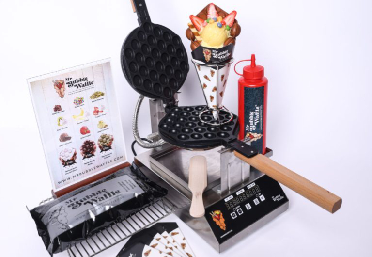 Il kit Mister Bubble Waffle per uso professionale comprende tutto ciò che è necessario per preparare, cucinare e servire un perfetto bubble waffle. Il kit ENTRY contiene: